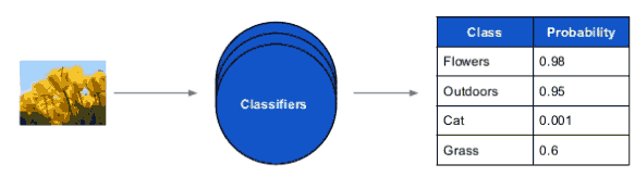 Flickr目标是:训练数千个分类器classifier,每天分类数百万的图片,然后计算自动标签,每半周激活一次自动预处理,能够在90天内全部做完。 上图中分类器能够判别这张上传图片0.98接近花,还有0.95接近标签分类:户外,Cat猫只有0.001可能性。