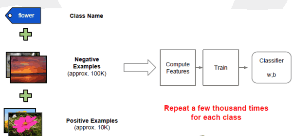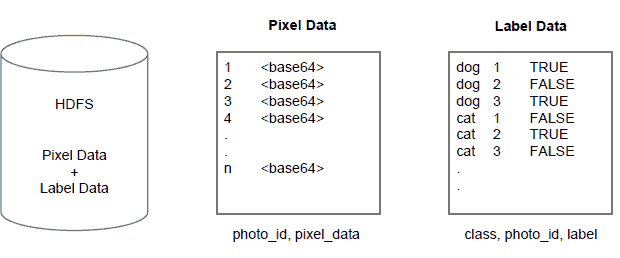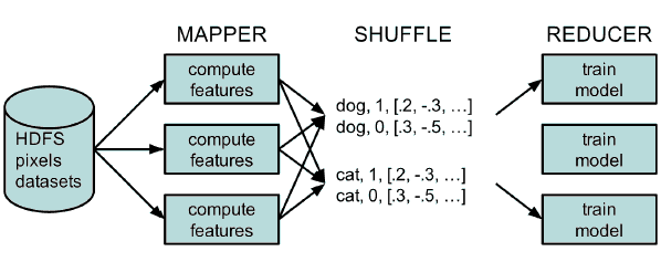 通过Hadoop进行归类,mappers发射 (photo_id, pixels)或 (photo_id, class, label)数据,而reducers利用排序产生 (photo_id, pixels, json(label data)),其中最后产生如: