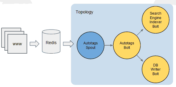 builder.setBolt("autotag", new AutoTagBolt(), 3) .shuffleGrouping("images") builder.setBolt("dbwriter", new DBWriterBolt(), 2) .shuffleGrouping("autotag")