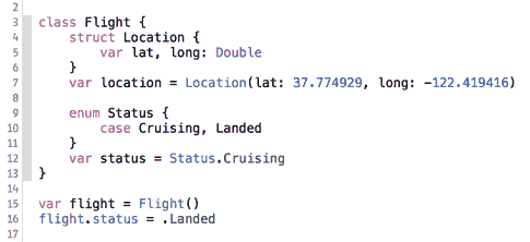 一个类里面可以嵌套其他类,这是其一个特点。注意到第9行enum语法,使用了类型推导。