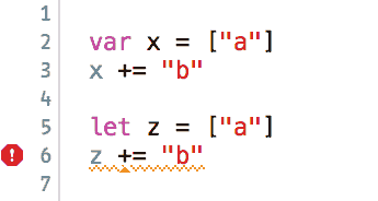 苹果鼓励你缺省使用常量,如同Scala语言一样,Swift内建了类型var 来创建一个可变的实例,这和Scala使用val表示不变量有点不同,Swift使用let来创建一个不变量。