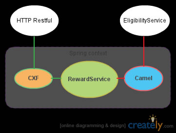 rewardService通过Apache Cxf作为Restful服务对外对客户端公开,其内部和帐号部门的EligibiityService通过Apache Camel整合。Camel相当于一个消息系统。