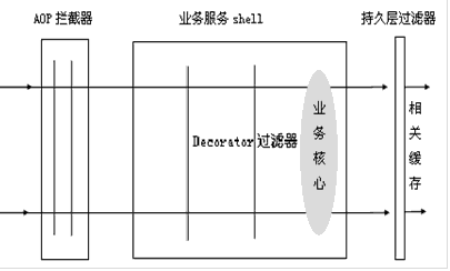 业务服务Shell是一个业务层的壳,这个壳也可以是多层,就象水果外一层层皮一样,我们将一些和业务数据相关的权限验证在这里使用Decorator实现,因为AOP拦截器并不能实现所有的权限检验功能,一般只能实现基于方法的权限检验,也就是检查某个业务方法是否可被调用,但是对于某些数据是否可被方法的数据相关验证则无能为力,这里使用装饰模式实现。
