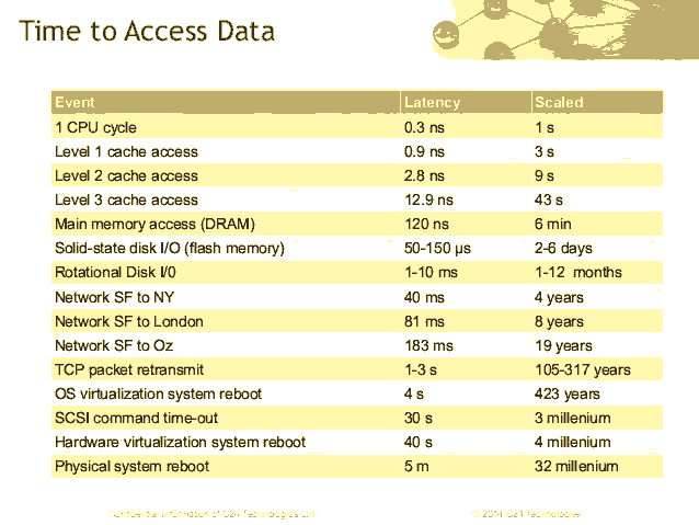 2.它会填满你的CPU缓存,因为垃圾回收强迫它们flush,将stack推入更高的L2和L3缓存,,然后推入主内存来获取数据,看看下面的各种设备时间延迟图,即使对象分配很快,也会引起Cache丢失,浪费很多CPU循环,降低了程序速度。