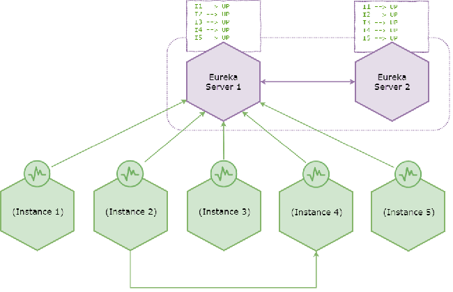 Eureka服务器与相邻对等方之间者采取复制注册表信息方式,并且这两个服务器注册表都指示所有微服务实例都处于UP状态。上图还说明实例2从Eureka注册表中发现实例4之后还调用了它。