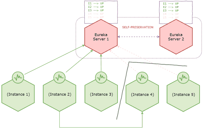 上图中由于网络分区实例4和5与服务器失去连接,但是实例2仍然连接到实例4,这时Eureka服务器会按照常理从注册表中删除实例4和5,因为它不再接收到这两个实例心跳,这时它也进入观察期,如果在一段观察期内又失去超过15%的心跳,它就会进入自我保护模式。